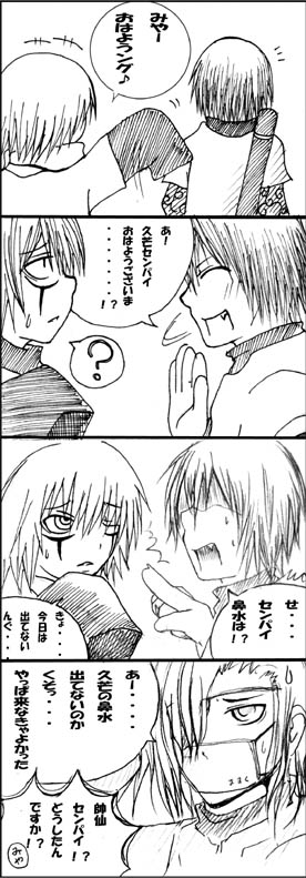 あー・・・管理人が風邪でへばってるので風邪ネタ。最後に録が突っ込んだ「バカだから」は、「バカ ラだから」なのか、ただ単に馬鹿にしてるのか、そこは想像にお任せします(笑十二支では、多分、猿野・獅子川・虎鉄あたりがぴんぴんしてるかと。途中でペンいれめんどくなってやめた(笑駄目だなーもう(/-`)ミスフル漫画メニュへ戻る